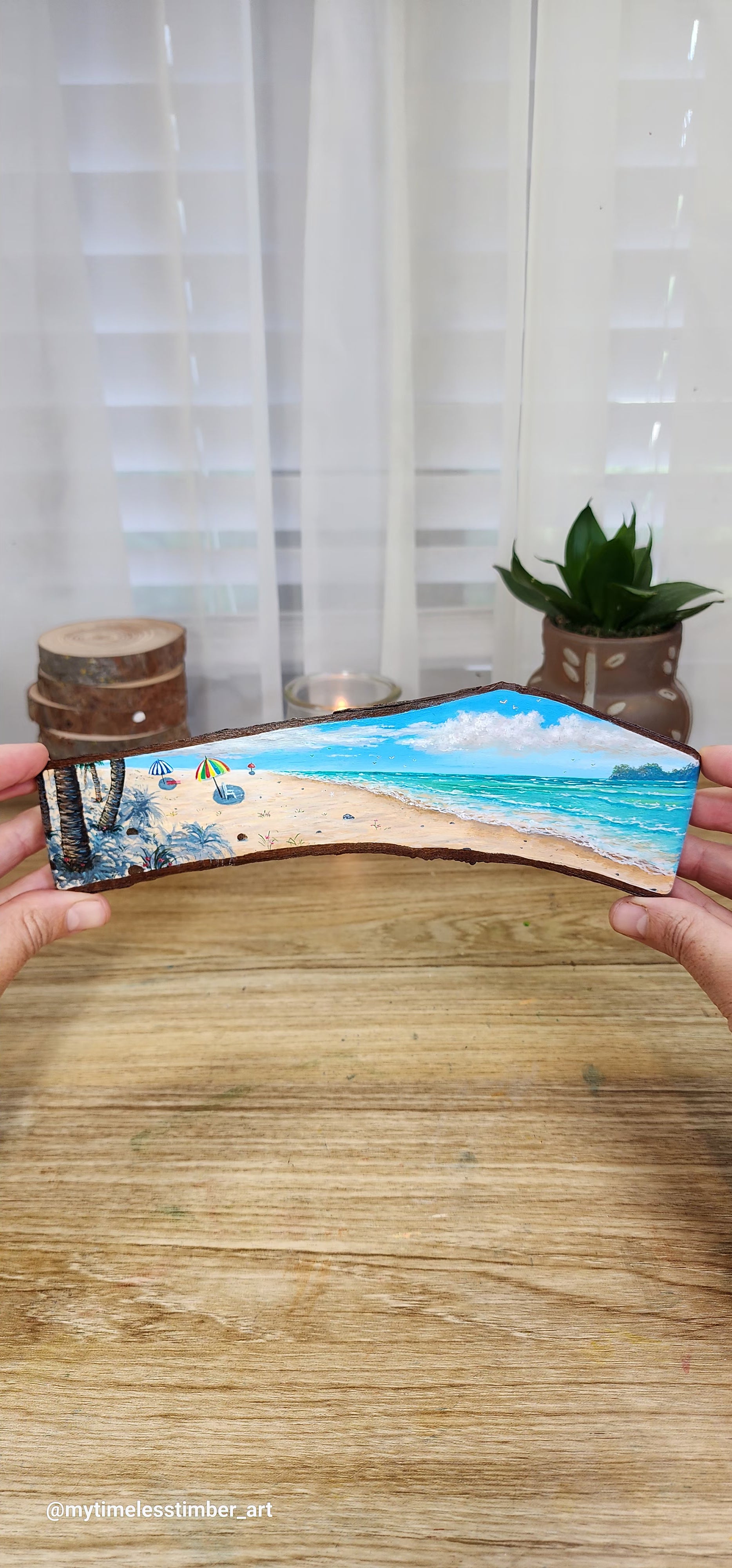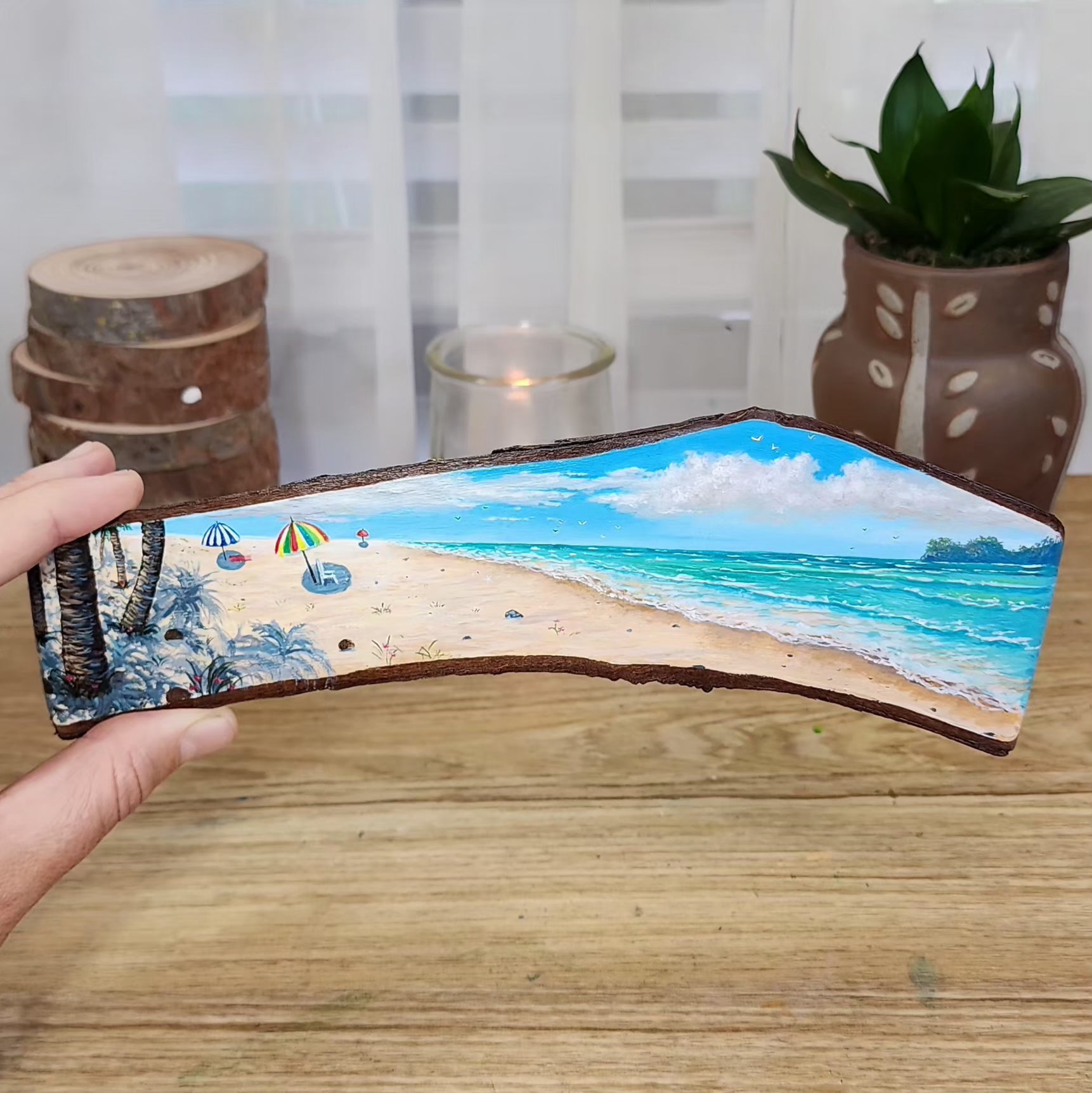 - An original acrylic painting done on a cut of a fallen tree branch.