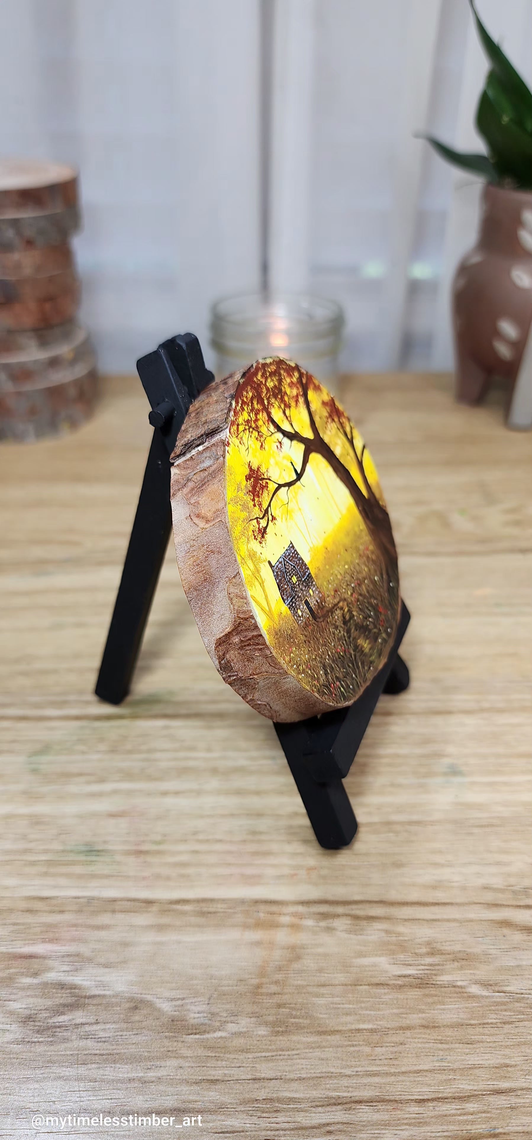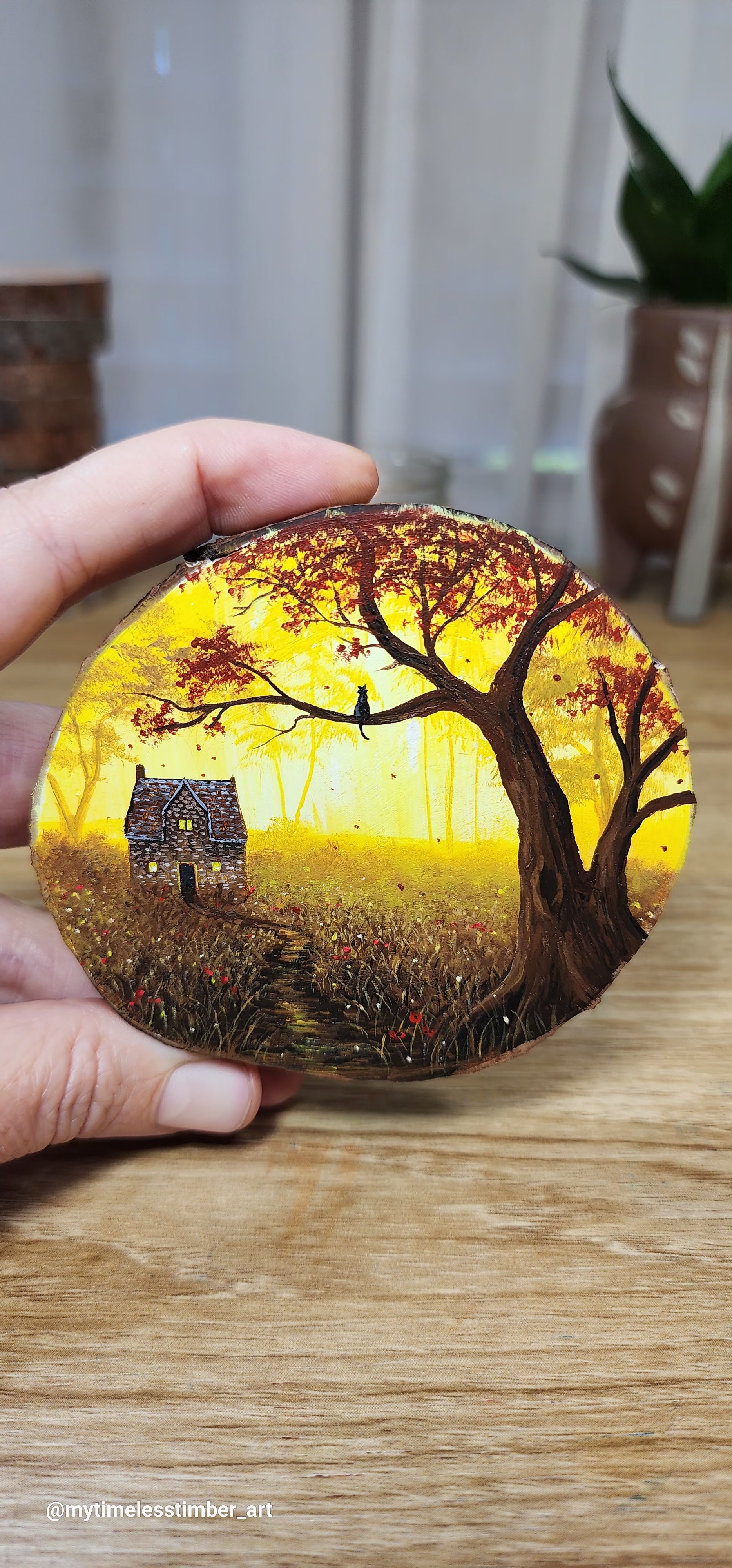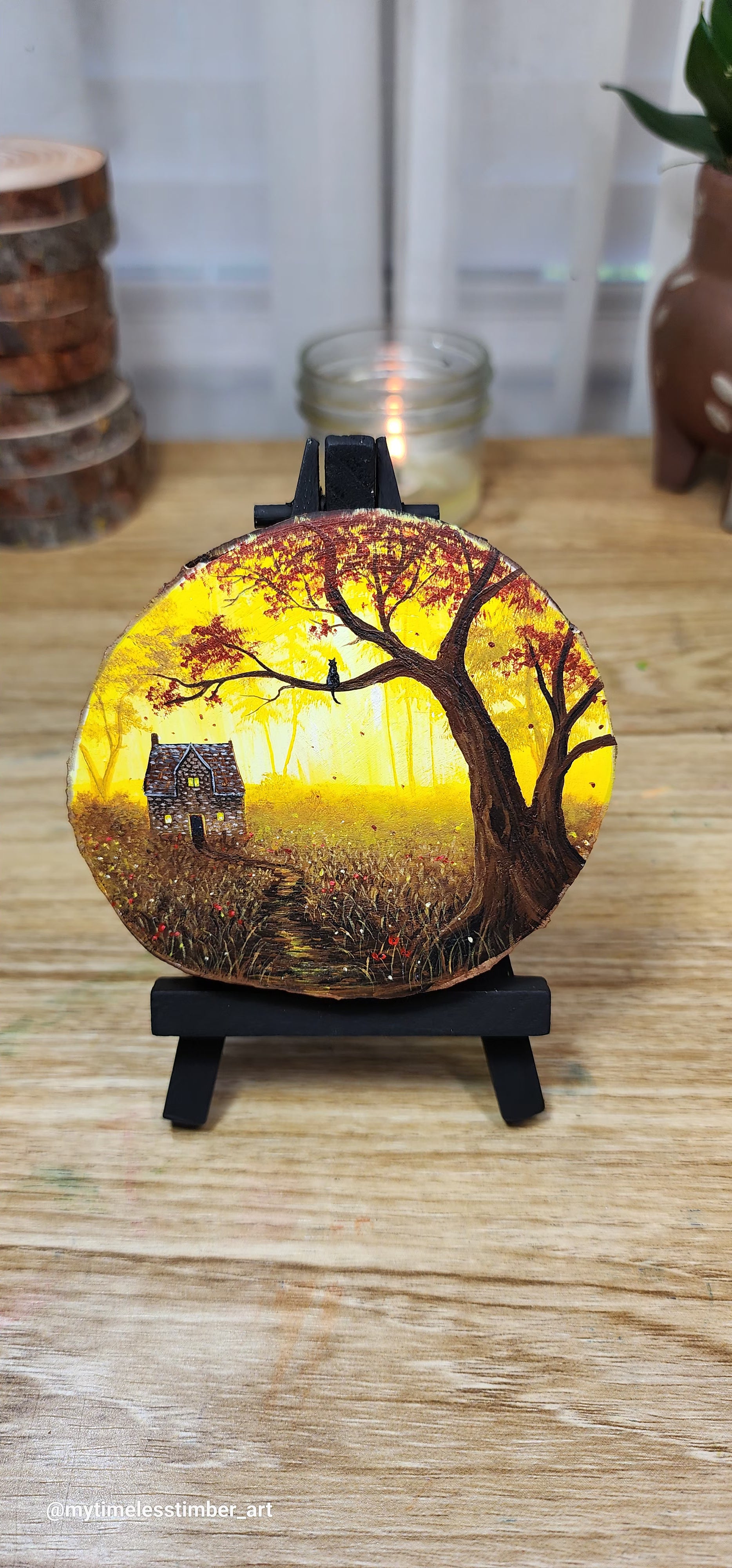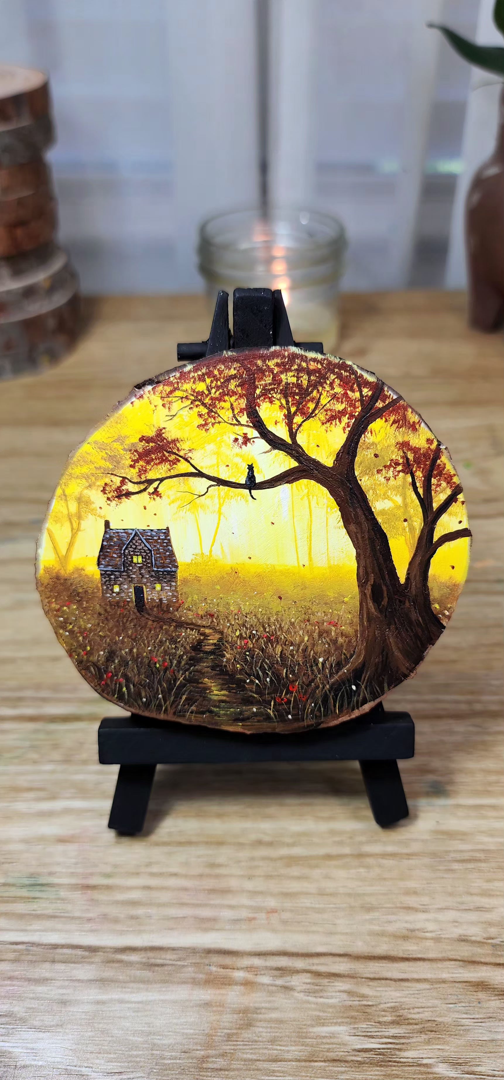 - an original acrylic painting done on a slice of fallen tree branch