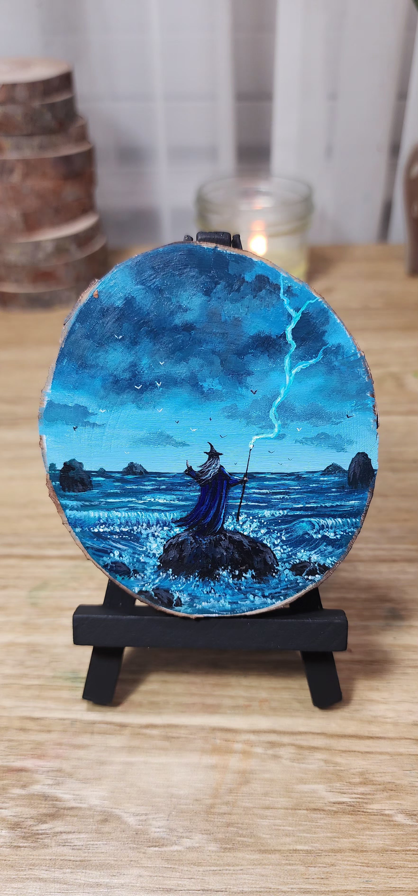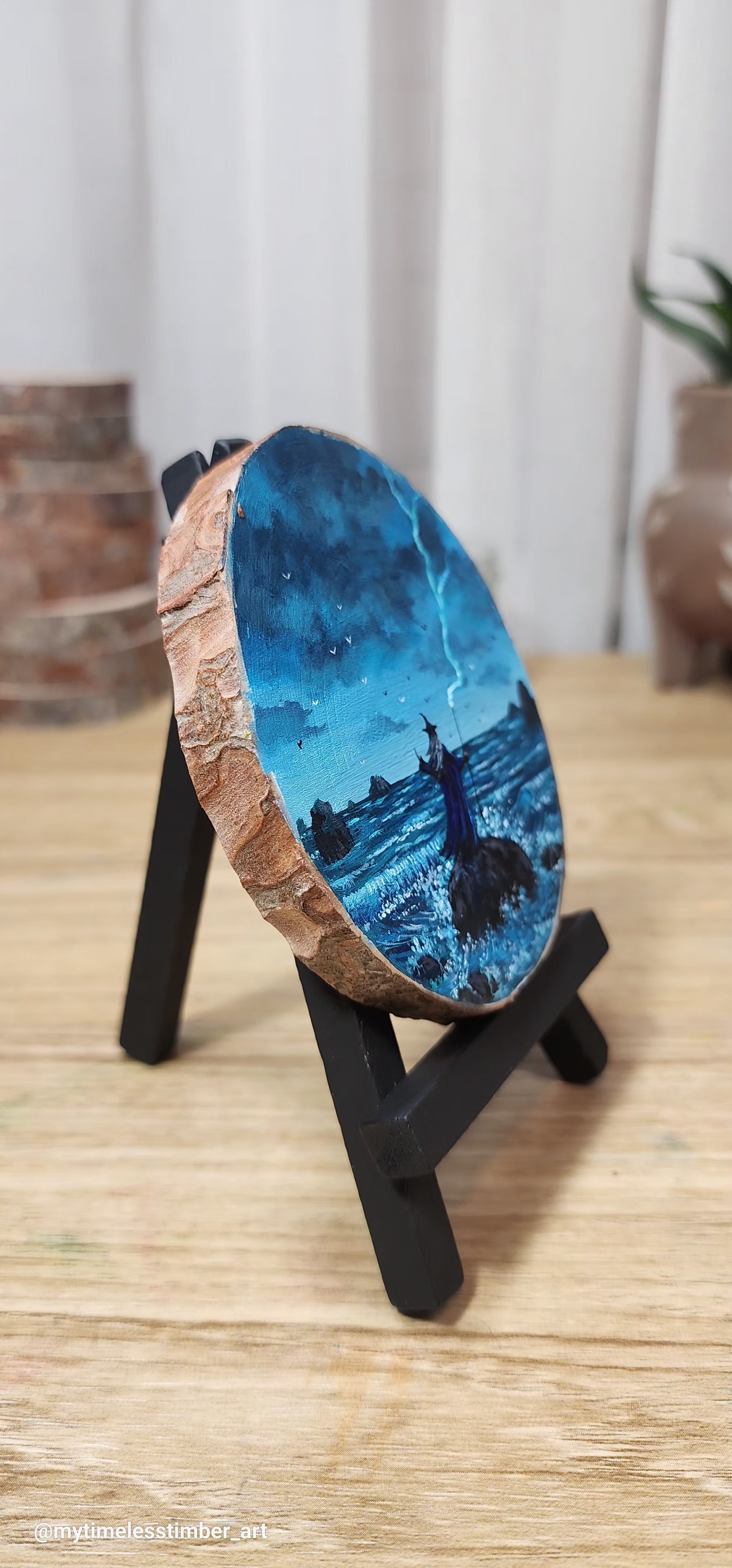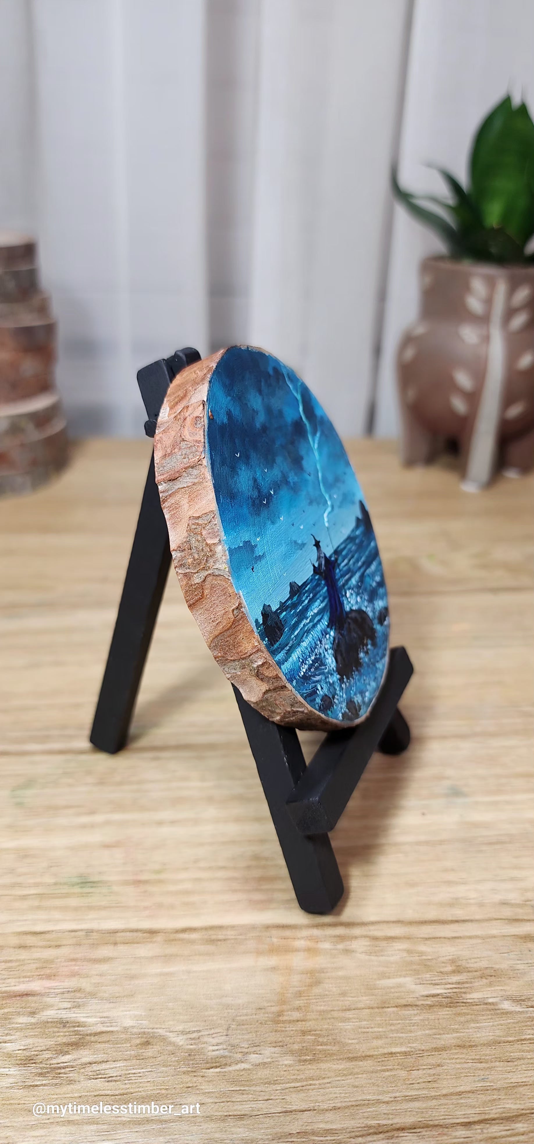 - an original acrylic painting done on a slice of fallen tree branch